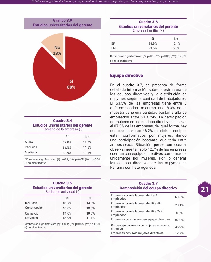 En el resumen ejecutivo, se presentan las principales conclusiones de este estudio realizado a estas empresas panameñas, cuyas características generales destacan que el 70% de las mipymes son empresas familiares (EF), que según el tamaño de la empresa se tiene que el 69% de las micro son empresas familiares, de las pequeñas el 77% y de las medianas el 63%.