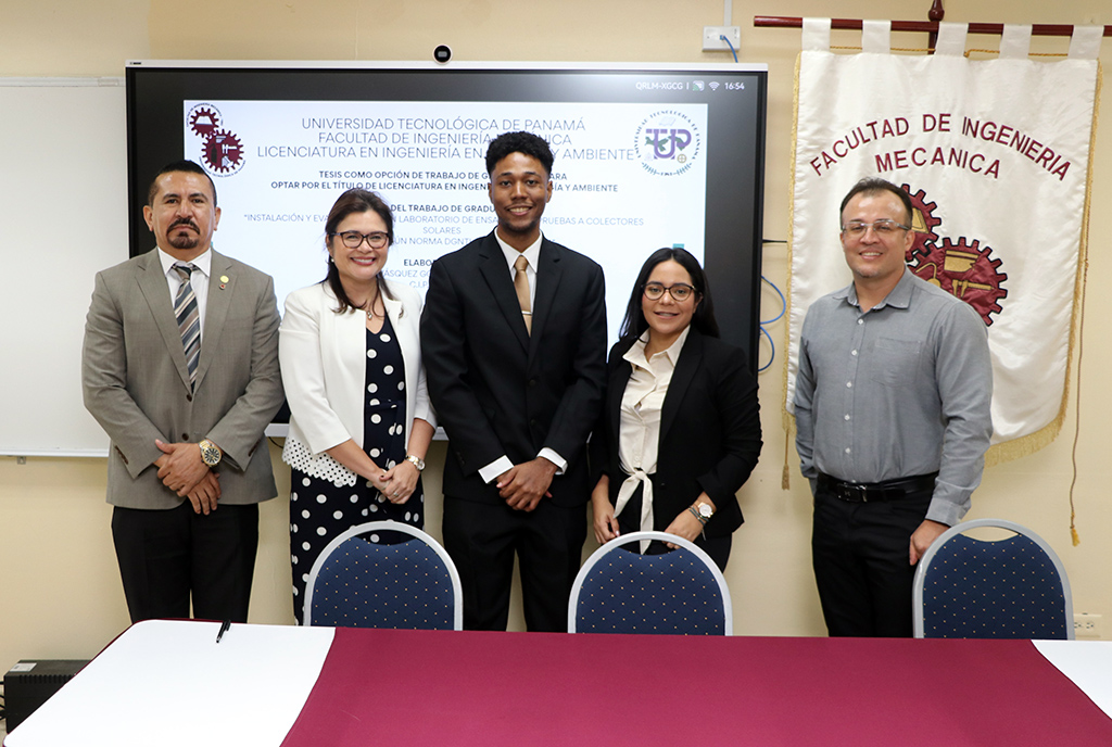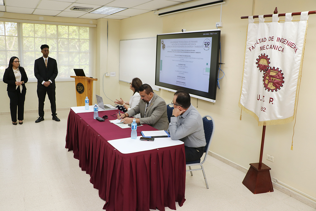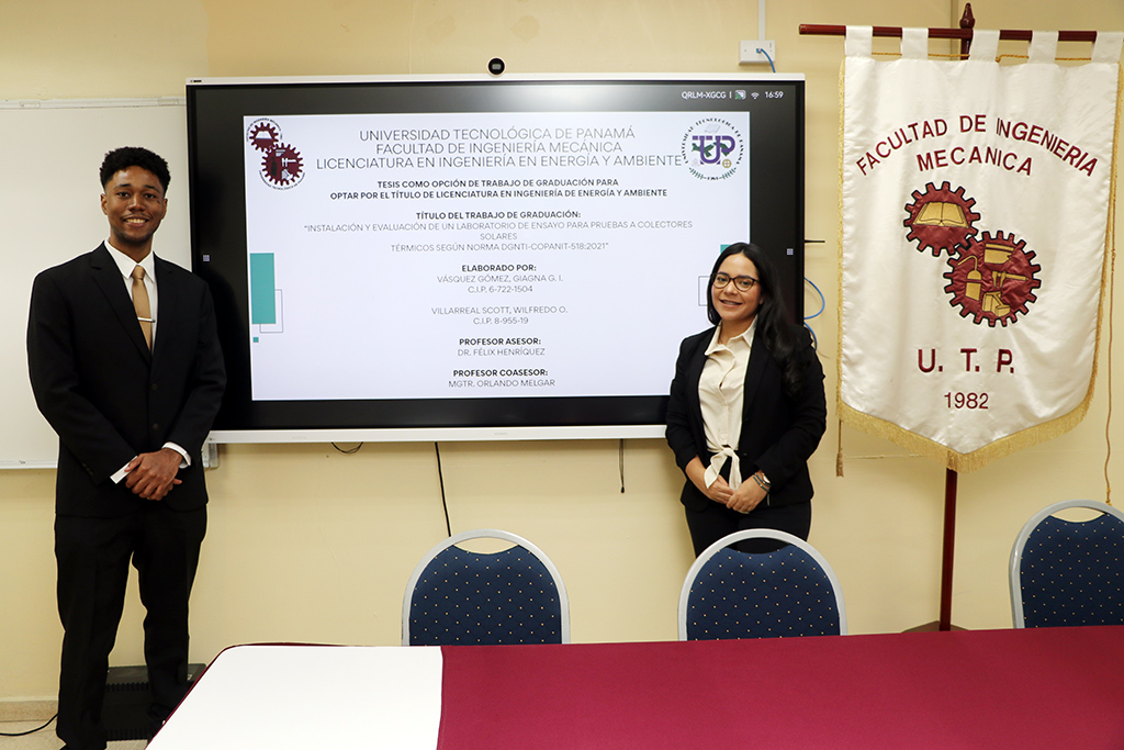 En el Salón de conferencias Wilfredo Robinson de la Facultad de Ingeniería Mecánica (FIM) de la Universidad Tecnológica de Panamá (UTP), el 21 de enero, se llevó a cabo el Acto de Sustentación de tesis titulada: Instalación y Evaluación de un Laboratorio de Ensayo para pruebas a colectores Solares Térmicos según norma DGNTI-COPANIT 518-2021, por parte del estudiante Wilfredo Villarreal y Giagna Vásquez, de la Licenciatura en Ingeniería en Energía y Ambiente, de la Facultad de Ingeniería Mecánica (FIM).